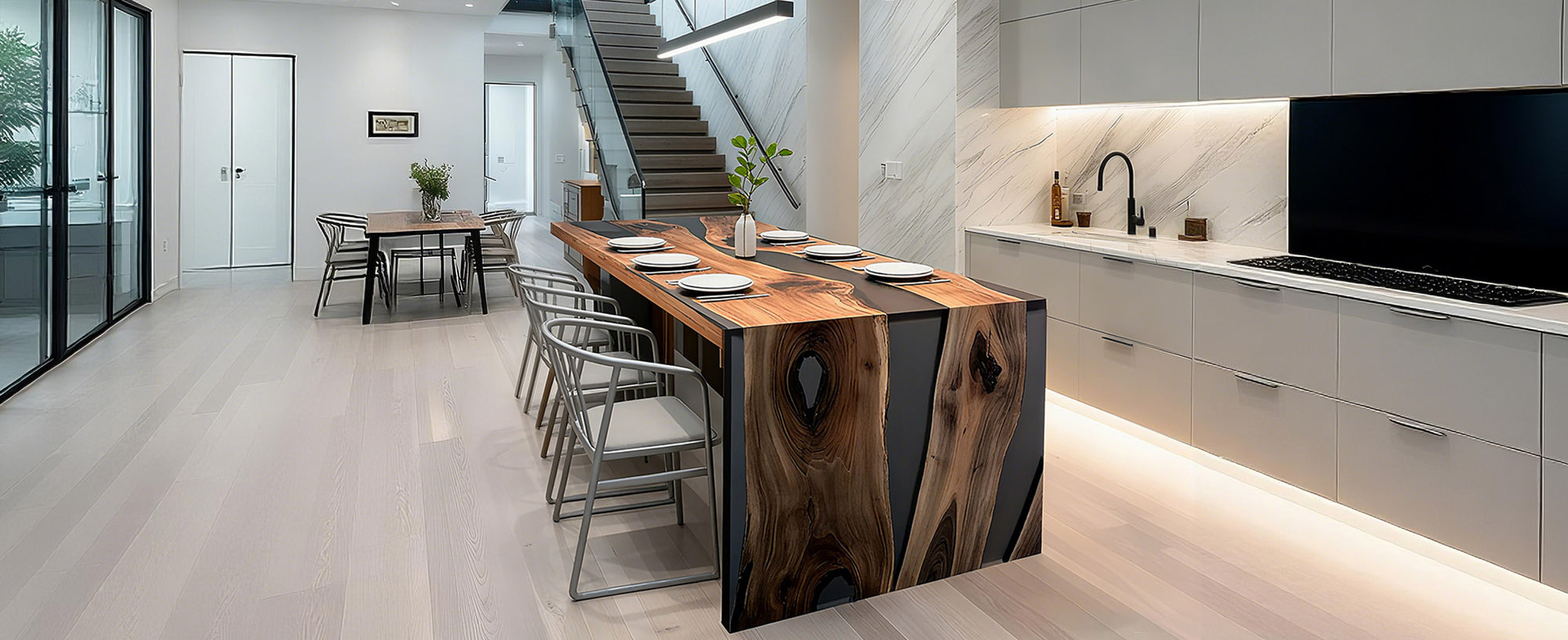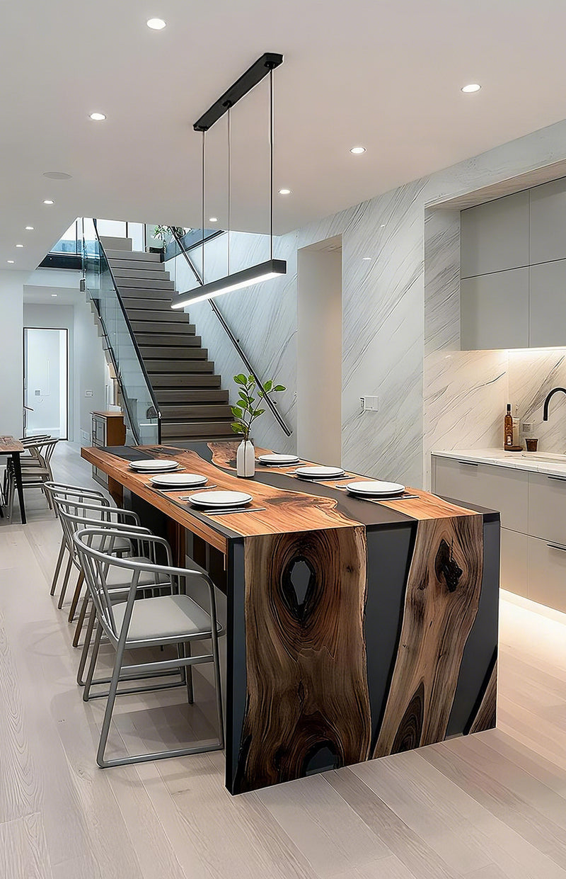 View full detailsHandcrafted from premium black walnut, this epoxy dining table features a sleek resin inlay and high-gloss surface. Perfect for dining rooms, kitch...