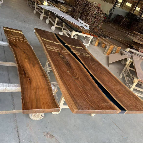 View full detailsThis handcrafted black walnut dining table and bench set features a translucent black epoxy resin river that seamlessly blends natural live-edge wa...