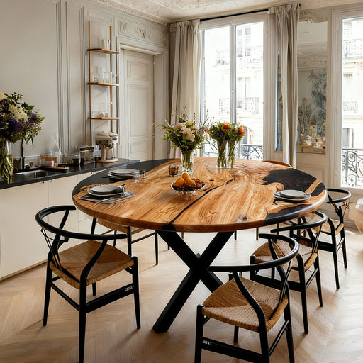 View full detailsHandcrafted oval walnut epoxy dining table with sleek black resin inlay. Durable and stylish, perfect for dining rooms or living spaces. Each piece...