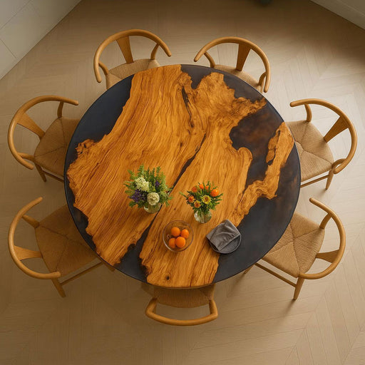 View full detailsElevate your dining experience with this handmade round burl wood black epoxy dining table. Its luxurious design and unique resin finish make this ...