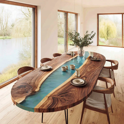 View full detailsCustom Luxury Walnut Epoxy Dining Table with Aqua River - A75