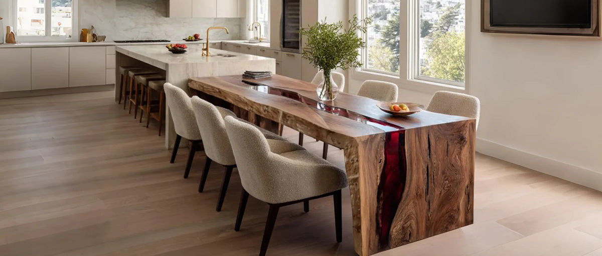 Introduce timeless elegance to your space with this live edge black walnut dining table featuring a rich burgundy red resin river. Crafted from pre...