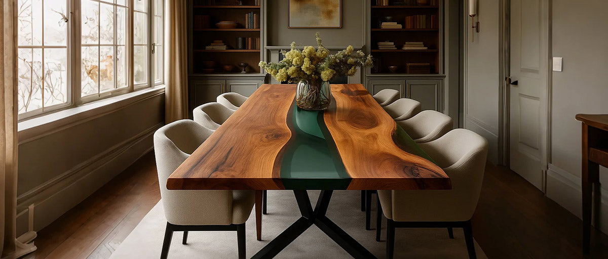 Crafted from premium live edge black walnut slabs and infused with emerald green translucent resin, this stunning epoxy river dining table is the p...