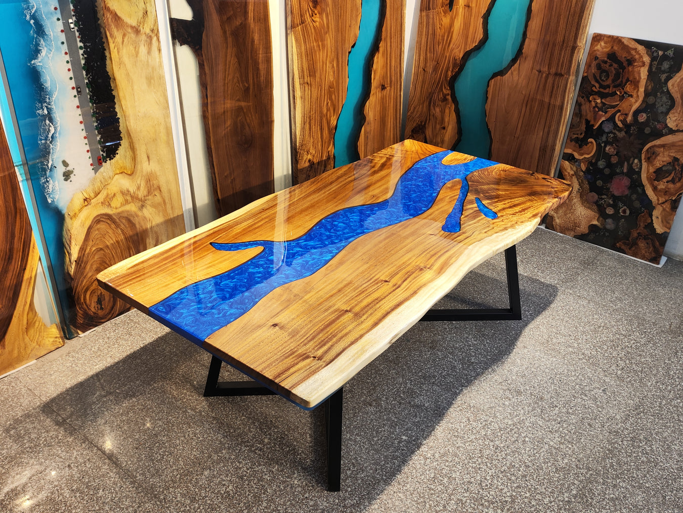 View full detailsTransform your space with this black walnut epoxy river table, featuring premium walnut wood and deep blue resin. Artisan-crafted, it brings coast...